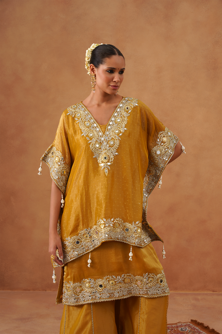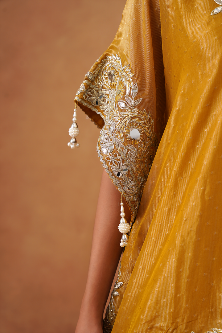 Golden as dusk, light as a whisper. This caramel tissue kaftan shimmers with the quiet drama of hand-done gotta and mirror work, each reflection catching the kind of light that follows confidence. The fabric glows from within, airy yet opulent, made to move with grace rather than restraint.