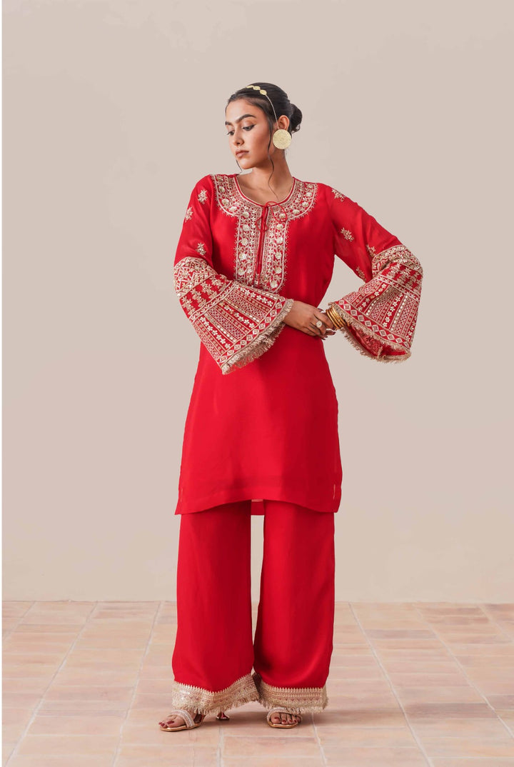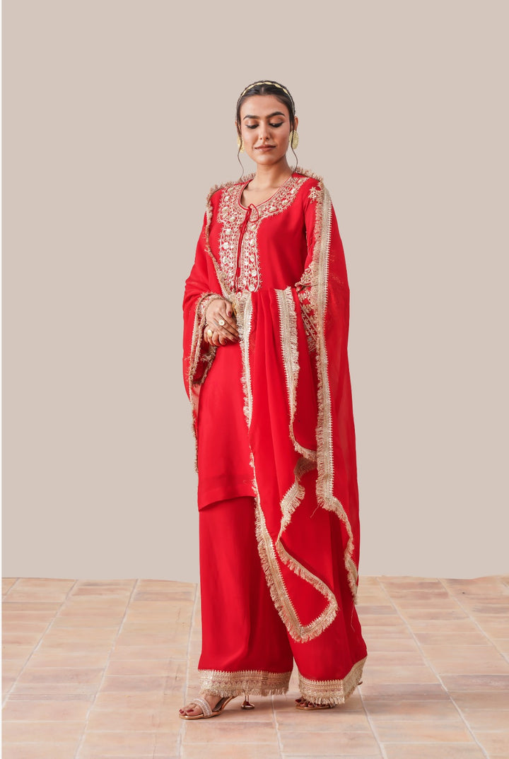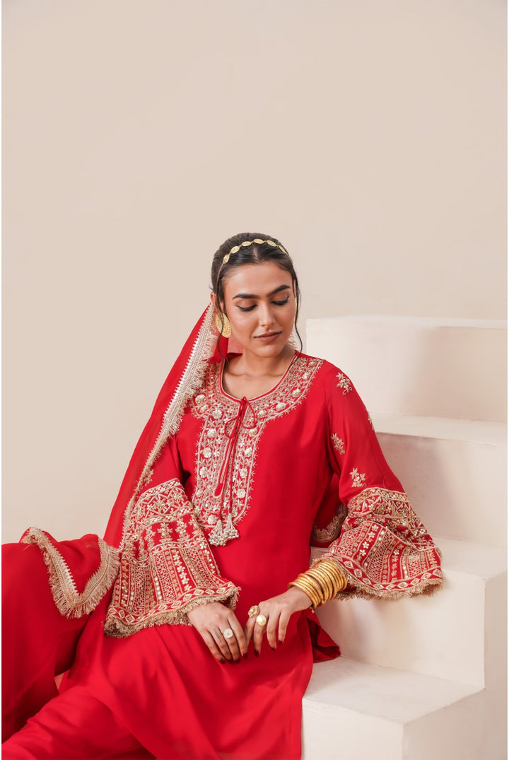 Drape yourself in timeless elegance with this pure Chinon suit from Tahraa. Handcrafted with intricate zardozi embroidery, every detail celebrates the finesse of traditional artistry. The rich red hue flatters every skin tone, while the lightweight, flowy fabric ensures effortless grace with every step. Whether it’s a festive gathering or an intimate celebration, this ensemble is made to make memories- and turn heads.