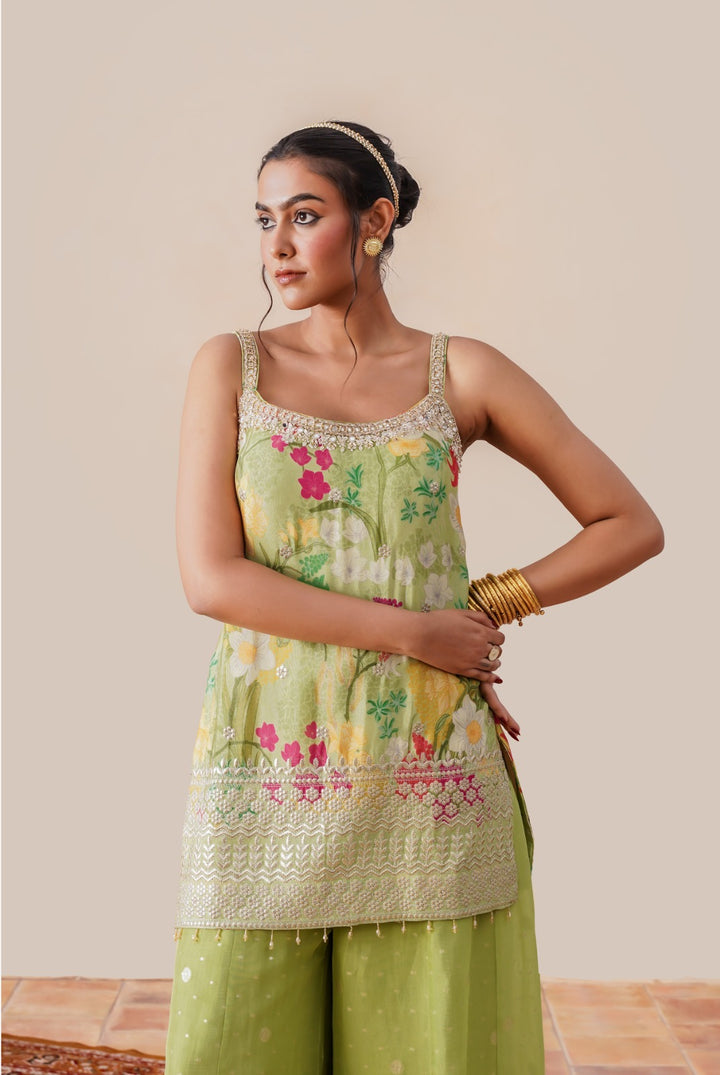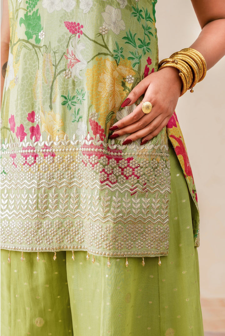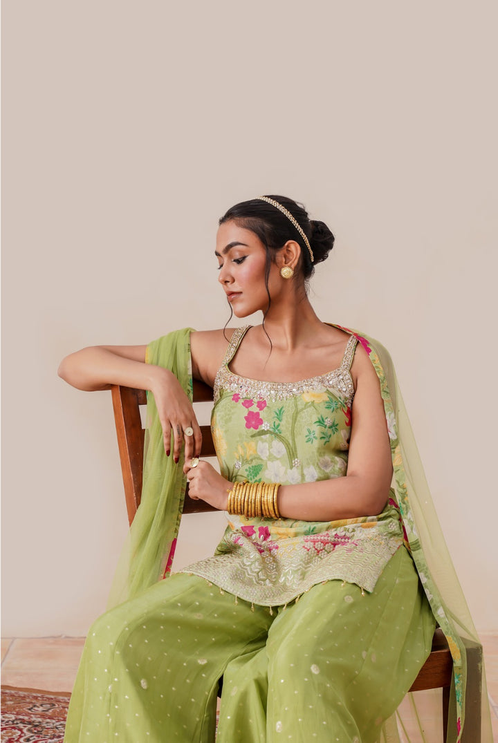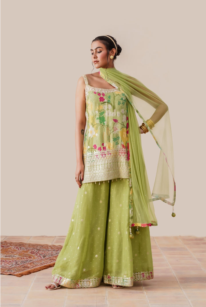 This sleeveless sharara set in a refreshing pistachio green chinon is a breath of fresh air. Adorned with subtle floral motifs and graceful shimmer, the flared silhouette flows like poetry in motion. Easy to wear, hard to miss-this one’s made for festive twirls and sunlit selfies.